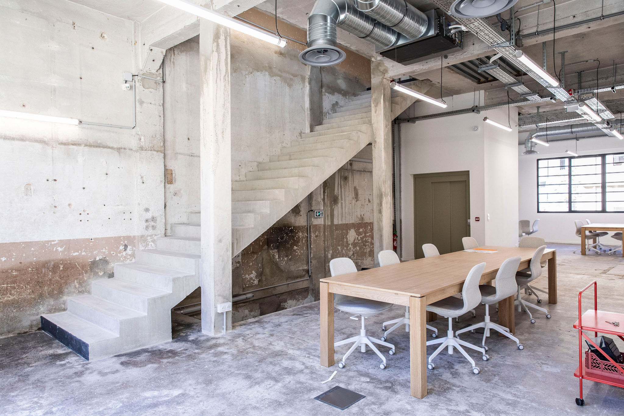 Nous avons souhaité préserver l’âme et la force architecturale du style brutaliste de cette ancienne usine de jouets des années 1940 en conservant les grands volumes, les matières brut, tout en travaillant la luminosité naturelle et la fluidité des espaces intérieurs et extérieurs entre eux.
